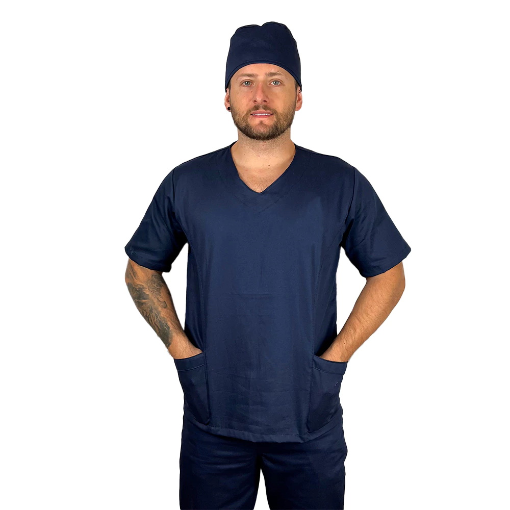 Conjunto Hospitalar em Brim Leve Azul Marinho - Camisa Gola em V Com 2 Bolsos Inferiores + Calça Elástico Total Com Touca De Brinde
